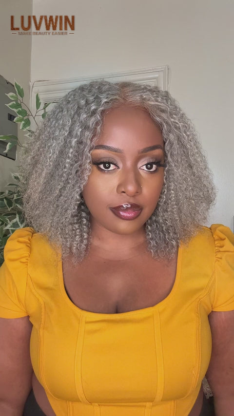 Luvwin 5x5 Jerry Curly Salt And Pepper Glueless Gray Color Pre-Cut Lace Fluffy Bob Wig 100% Real Human Hair