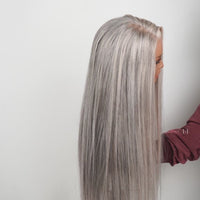 Keywords: Salt and Pepper Wig, Long Straight Gray Wig, Silky Silver Wig, Natural Gray Blend, 13x4 Lace Wig, Human Hair Wig.